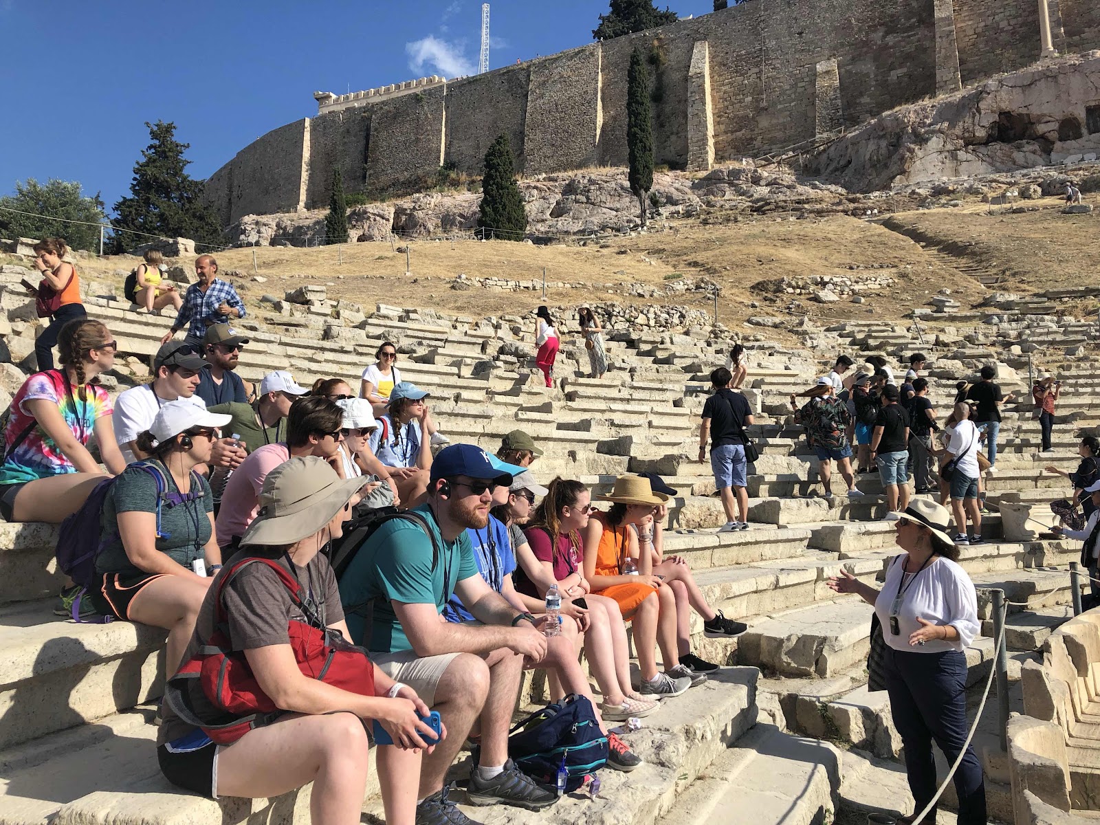 Today, we started out by walking to the acropolis. There we saw the Theatre of Dionysius, the Hospital of Hippocrates, the Hadrian’s Odeon, the Temple of Nike, the Erechtheion (dedicated to Poseidon), and the Parthenon (home of Athena). After this visit we went to Mars Hill where the Apostle Paul preached to the Areopagus and the learned people of Athens. We took a break to listen to Paul’s teachings from Acts 17 about the unknown God and considered what is the unique thing that faith brings to the world that nothing else can. This was followed by a march through the ancient agora and a visit to the Stoa Museum. Lunch - what to say about lunch? Bread, salad, mixed meat plate, and orange olive oil cake. While in a food coma, we walked through the magnificent Acropolis Museum which houses so many memorable pieces of ancient artwork and the devastatingly beautiful Caryatids (statues of young girls that were designed to serve as columns for the Erechtheion). Pictures will not do this day justice, but here are some of the highlights.
